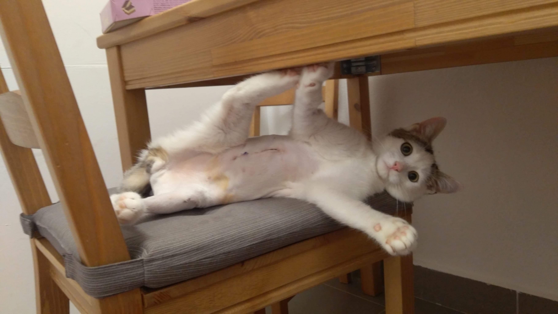 Po operáciách sa rýchlo zotavil a na klinike sa zabýval. Dnes už neužíva žiadne lieky, dýcha s ľahkosťou a nohu stále viac a viac zaťažuje. Je to krásne, veselé a hravé mača. Jediné čo mu ku šťastiu ešte chýba je nový milujúci domov.